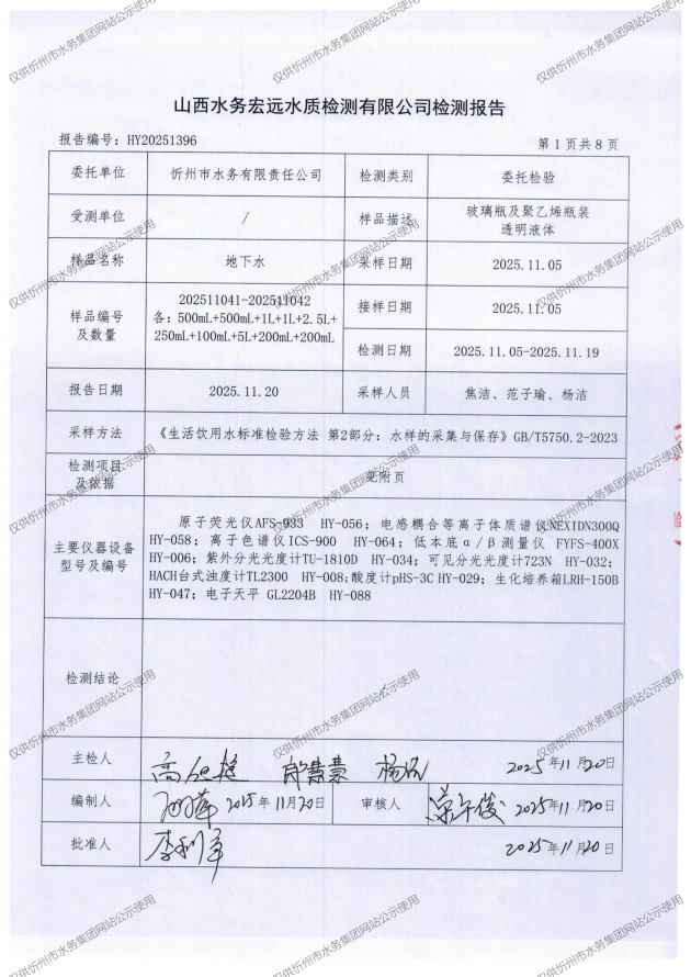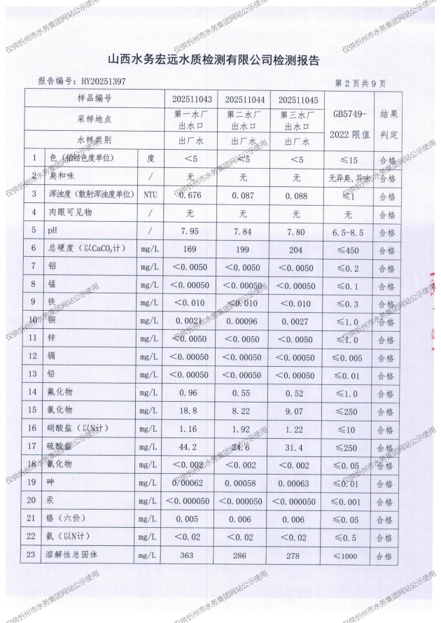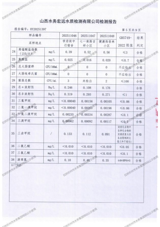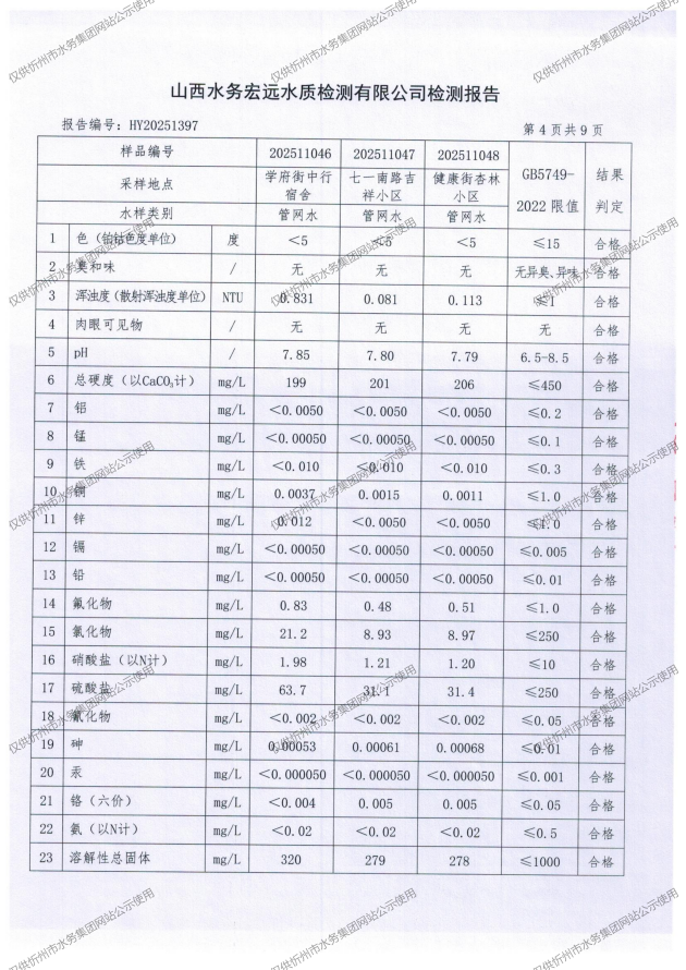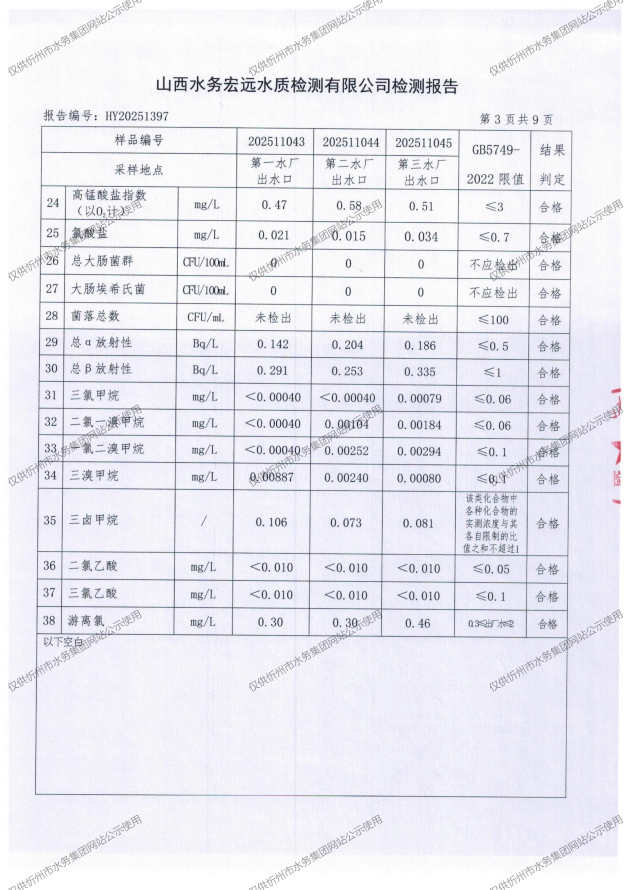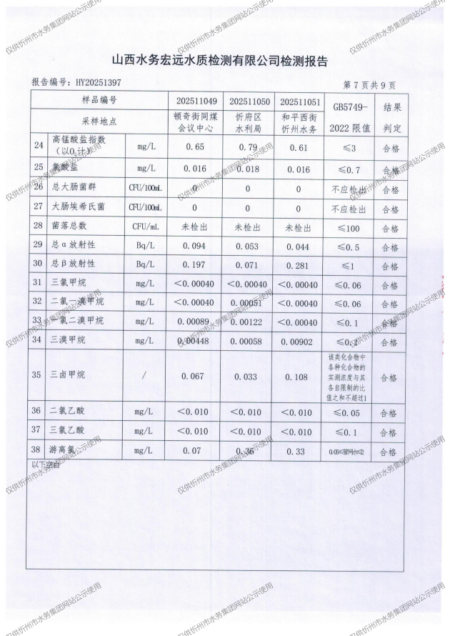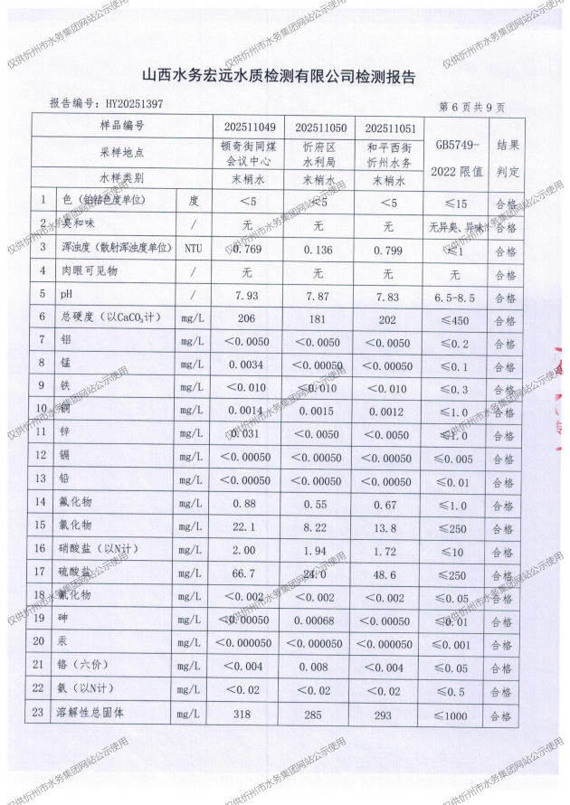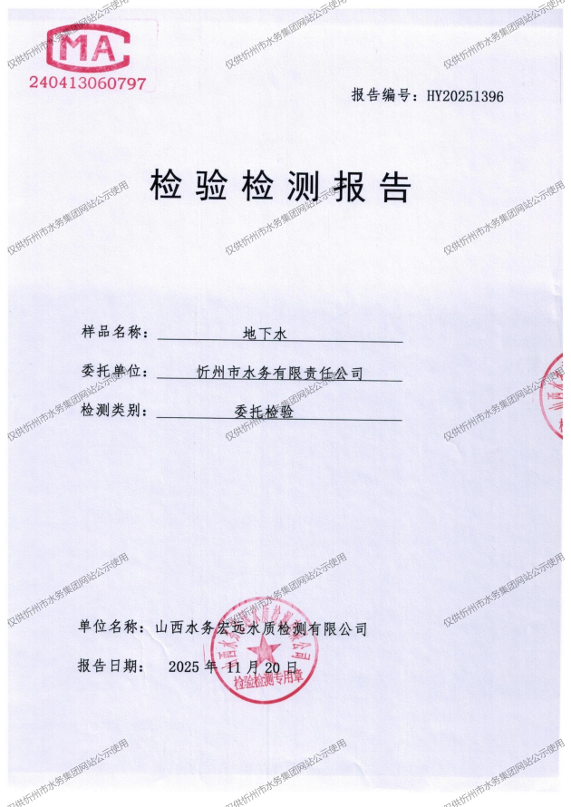 忻州城區(qū)公共供水水源水、出廠水、管網水、管網末梢水2025年11月份水質信息公示