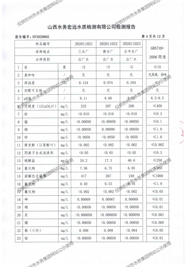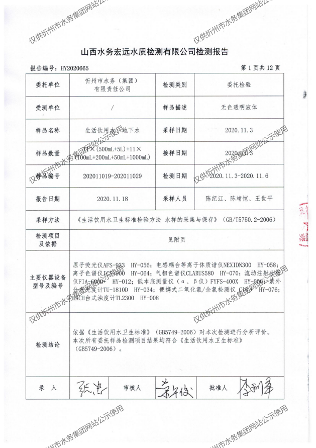 忻州城區(qū)公共供水水源水、出廠水、管網(wǎng)水、管網(wǎng)末梢水2020年11月份水質(zhì)信息公示